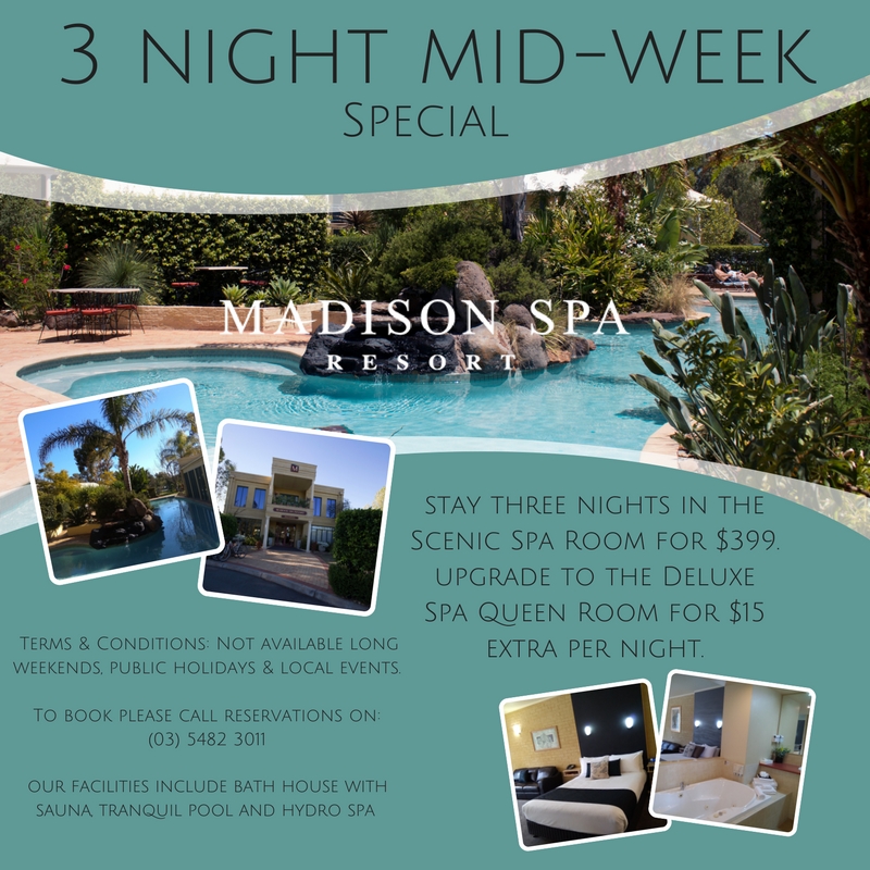Stay 3 nights mid-week accommodation for two in the Scenic Spa Queen Room. You can also upgrade to the Deluxe Queen Room for more space.